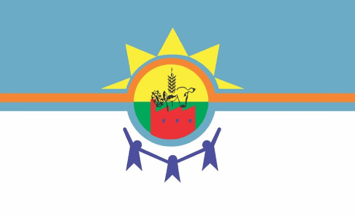 The flag is horizontally divided blue over white, with a narrow orange over blue stripe at the contact. Over all is the district logo.