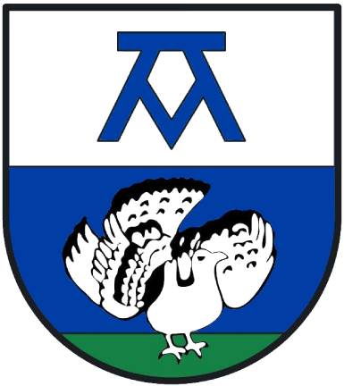 in blue for its name over it. The lower half is composed of an azure field and depicts a white turkey