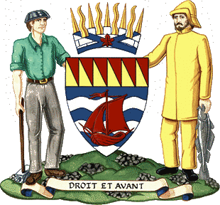Dexter a steel worker of the 20th century holding a steel worker's hammer head downwards, sinister a fisherman habited in oilskins holding a codfish haurient, both standing on a grassy mount set with outcroppings of coal proper;