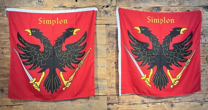 Gules a bicapitated (double-headed) eagle displayed Sable beaked and membered Or holding to dexter a