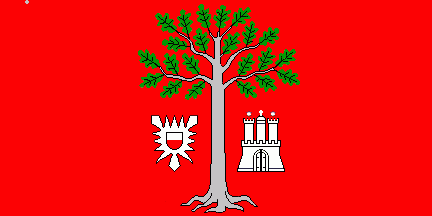 Shield Gules an eradicated oak Argent leafed Vert, flanked at dexter by the former arms of Holstein (shield parted per fess of Argent and Gules on a nettle leaf Argent) and the arms of Hamburg, both without shield.