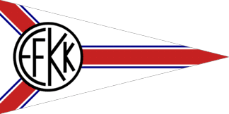 Shifted to hoist is a white disc with black edge and inscription "EFKK" with "E" alongside the edge and central "K" bigger.