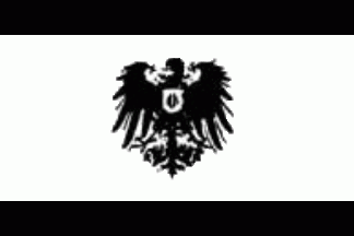 The flag is divided by a black cotized saltire. The hoist and fly quarters are horizintally divided into black over white over red, the colours of (2nd) German Empire). The other quarters are white containing a Gothic black capital "E"(top) and a black eagle(bottom).