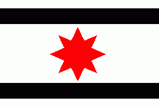 The flag was white with a centred red 8-point star between two black horizontal stripes.