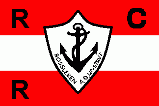 On centre on a white shield a black anchor with rope and black inscription "ROSSLEBEN"(alongside dexter base) and "A.D. UNSTRUT"(alongside sinister base).