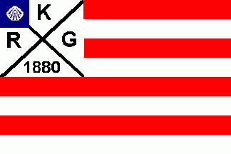 The canton is a white square divided by a black saltire with black capital letters "K"(hoist), "KR"(top), "G"(fly) and "1880" (bottom).