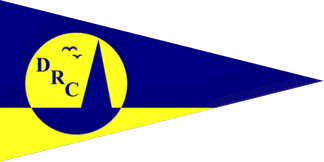 Shifted to hoist is a disc in counterchanged colours, the yellow part displays a blue triangle, representing a sail, two blue flying birds and a blue inscription "DRC" in bend.