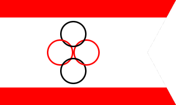 It was a white flag with thin red stripes along the top and bottom edges, a shallow triangular cutout at the fly, and a device on the white area consisting of four interlocking rings, two red ones horizontally and two black ones vertically, shifted to hoist.