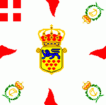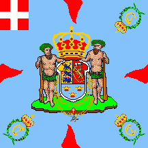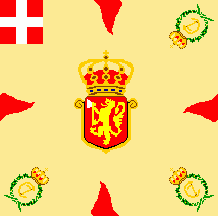 The flag was light blue with red flames and coat of arms as follows: shield parted per fess: above at dexter Or three lions passant Azure in pale surrounded by nine heartlets Gules (for Denmark),