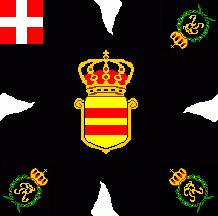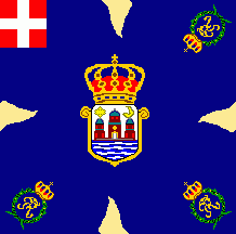The flag was dark blue with buff flames and the city arms of København, displaying three towers over a base covered with waves. For further details see: English WIKIPEDIA