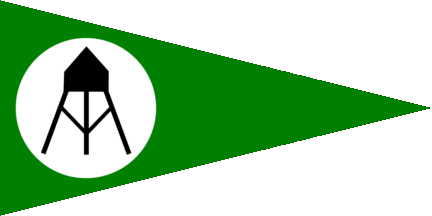 The pennant is is vertically parted of white and dark blue, the white half is fimbriated blue. In canton is a yellow anchor in bend.