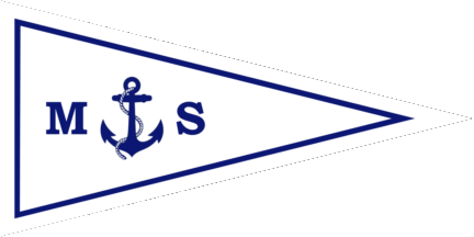 The pennant is white cotised blue-white, shifted to hoist is a blue fowl anchor in pale, flanked by blue initials "M" and "S" (see left image above)