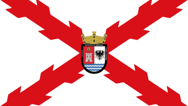 Coat of arms: Per fess, 1. Argent [very light gray] a holly oak proper [plain green on the flag], 2a. Gules three keys argent placed 2 and 1, 2b. Wavy argent [very light gray] and azure [light blue]. The shield surmounted by a Royal Spanish crown.