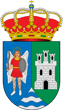 Description: Shield divided. On the right, on a field of azure, Saint Michael the Archangel in his natural form, with gules robes, wings, sword, and shield argent. On the left, on a field of vert, a silver castle masoned and with sable windows and doors. In base, argent, two azure waves.