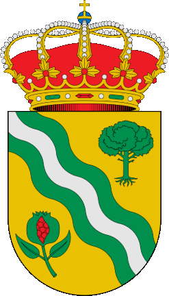 Description: Gold shield. Bend three waves of vert, argent and vert; on the dexter side a pomegranate vert split gules and on the sinister a pine tree vert. Crested with a closed royal crown.