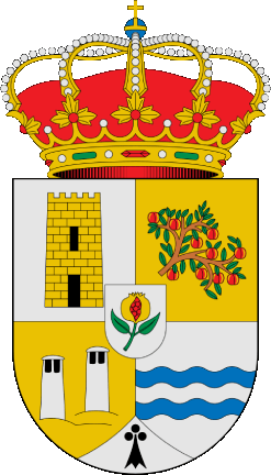 Description: Quarterly divided. First, argent, a tower or, windows and masoned sable. Second, or, a fruited branch proper. Third, or, two chimneys argent, windows and doors sable. Fourth, argent, three wavy fesses azure and argent. In base, argent, an ermine sable. Overall, an escutcheon argent with a pomegranate or, seeded gules and leaved vert. Crest: a closed royal crown.