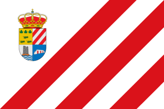 Description: Rectangular flag, with proportions 2:3, with the following arrangement: in the upper hoist corner, on a white background, the municipal coat of arms is superimposed. Below and diagonally from the lower hoist corner to the upper fly corner, three red bars, covering the rest of the flag.