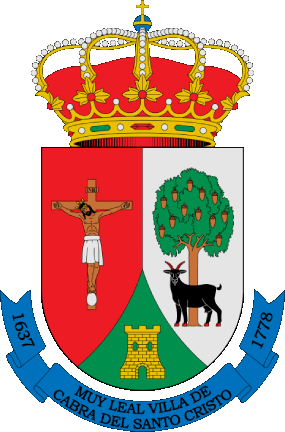 Description: “A shield in Spanish shape, outlined in gold; parted per pale: dexter, on a field gules, the image of Christ of Burgos with his characteristic white loincloth and an ostrich egg at his feet; sinister, an oak tree, its trunk adorned with a crown of green foliage, enlarged; in front a black goat, statant guardant, clawed and horned gules; the foot vert, a tower, open, masoned, and windowed in black. The motto is a blue ribbon around the shield's mouth, with the monogram in black letters: 1637 * Very Loyal Town of Cabra del Santo Cristo * 1778. The crest is a closed royal crown, composed of a gold circlet and precious stones, with eight fleurons and eight pearls interspersed, closed with four arches also adorned with pearls, supporting a globe of azure, with a gold equator and semimeridian, and surmounted by a gold cross, the crown lined with gules.”