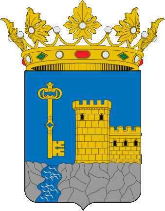 Description: Azure, a castle Or, masoned and windows Sable, issuing from the sinister upon rocks proper, between which runs a stream in their color, the castle flanked by a key Or, placed vertically, with the eye looking towards the chief. Crest: an open royal crown.