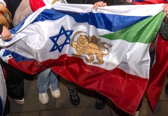 image located by William GarrisonIsrael-Iran friendship flag (Iran flag with state emblem before 1979). Seen in Golders Green, Barnet,