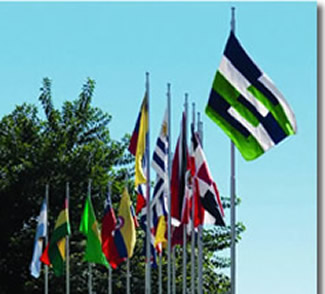 The current flag was announced on December 9, 2008 in which 300 proposals were submitted and the winner was made by Peruvian Architect Jaime Augusto Botteri Lequernaqu茅, who was awarded $5,000 USD. The flag is explained as follows (original in Spanish): "Designed with the basic colors of the corporate identity - blue, red and white - the winning flag is composed of nine curved horizontal strips, which start from both sides and interleave in the third of the fly side, like the "fingers of a hand," symbolizing union, regional integration, financial support and sustainability. The use of curved forms signifies the dynamism of development and the mobilization of funds." Source: