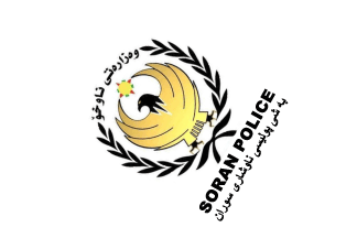 The Soran Police flag is white and has the regional government logo centered upon it. Underneath the logo is SORAN POLICE; in English and then in Kurdish. These elements are diagonally placed to appear upright on indoor flag stands.