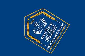 The logo of Northern Technical University has a golden border shaped as a dome. At the bottom is Northern Technical University in Arabic (white) and in English (gold). The background of this logo is blue. To the sides are golden branches, curved and pointing to a star. Underneath this star is IRAQ in gold. Underneath them is a symbol and years of foundation; to the left 2014 in the regular calendar and to the right 1435 as the Hiriji year of its establishment, both in white. In the center: above is an open book reading its initials of N and U on its pages, stylized to show more pages. In between the two pages is a stylized torch of enlightenment; below: a castle depicting a graph rising (left) on its tower; a computer screen with symbols emerging (right) on its tower; in the center a depiction of a monitor; and above this two cogwheels. These show the mission of the university.