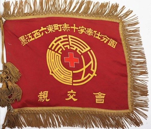 It was a Red Cross auxiliary flag from Sumiyoshi Ward, Osaka. The texts read: "Sumie-Nishi 6 Higashi Chome Red Cross Service Branch" "Friendship Club".