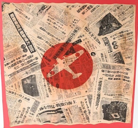 Sadly, the source does not provide more information about this flag (?). Source: https://milestoneauctions.hibid.com/lot/263613072/wwii-japanese-propoganda-silk-flag-bring-back-ww2?ref=catalog Caption: WWII Japanese flag brought back by Ralph Belfiglio 473171 of Co. B, 1st Battalion 2nd Marine Division. The flag measures 28 X 27 inches with Japanese Newspaper articles printed over top of it talking of Victories of the Imperial Japanese Army and Navy.