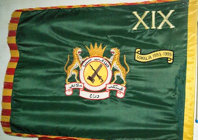 Caption: A flag of the "XIX (19th) ROYAL MALAY REGIMENT (MECHANIZED)"; the hoist side is at the right. "Batt 19 RMR (Mech)" was stationed for duty in Mogadishu, Somalia 1993-1995, with "UNOSOM" ["United Nations Operation in Somalia"]; this battalion had been assigned as the "Force Quick Set" ("Quick Reaction Force") for UNOSOM. The lettering on this flag is in the "Jawi script", which is based on Arabic script. (Source)
