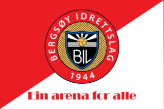 The flags of Bergsøy IL (Bergsøy Idrettslag) from Fosnavåg in Herøy Municipality are red or red diagonally over white with the badge centered.