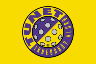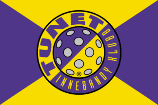 The flags of Tunib IBK (Tunib Innebandyklubb) from Oslo are yellow or quartered per saltire yellow and blue with the badge centered.