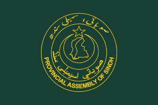 The provincial assembly emblem has green details. The outer ring reads PROVINCIAL ASSEMBLY OF SINDH at the bottom; the same in Urdu at the top. Within is another circle, reading Government of Sindh in Sindhi at the bottom. Above this, a crescent has just above it a map of the province, where a line divides the agricultural and desert zones created by the Indus River. Above, a star is seen completing the star and crescent for the national religion.