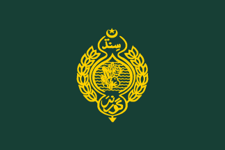 The flag of the governor of Sindh is a green field with the governor emblem in the center. This emblem is a central onion shape depicting its main crops over multiple waves, as its name means river. There are three interconnected circles surrounding it; above Sindh is read in Urdu. In the lower circle, governor is read in the same language. To the sides of the circles, a curved branch is seen.