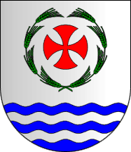 Shield Argent an orbicular cross Gules surrounded by a chaplet of wheat ears Vert, on base wavy Azure a bar gemel wavy Argent.