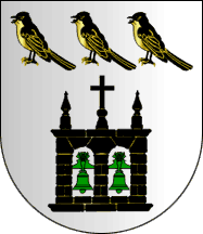 Shield Or a church Sable masoned Argent with port and windows Or, in dexter chief a sinister facing sparrow statant Sable garnished Or,