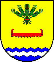 Shield Or with base wavy of Azure and Argent, on centre a bi-manual saw Gules in fess, on chief five rye ears Vert tied Gules. Mural crown Argent with three visible towers (village rank) and white scroll reading in black upper case serifed letters "PEPIM - CASTRO DAIRE".