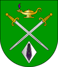 Shield Vert two swords inverted Argent hilted Or and crossed per saltire, in chief a lamp Or flamant Purple, in base on a lozenge Argent a palm frond Purple.