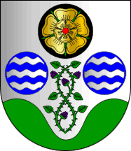 in chief a gunstone (= a black roundlet) charged with a heraldic rose Or seeded Gules and barbed Vert, in base a valley Vert.