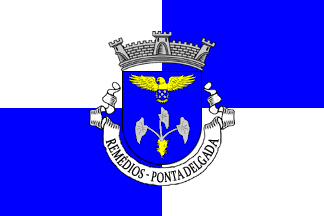 Mural crown Argent with three visible towers (village rank) and white scroll with inscription in black initials "REMÉDIOS - PONTA DELGADA".