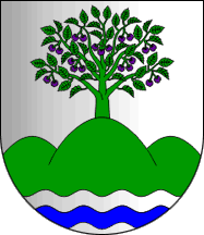 Shield Argent with base wavy of Argent and Azure, issuant from base a triplemount Vert, issuant from the central peak a cherry tree Vert fructed Purpure.