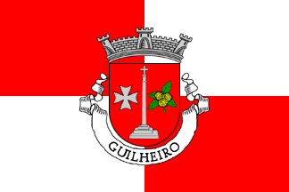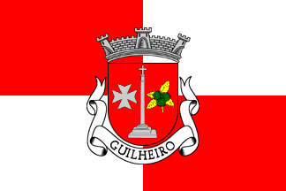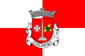 Shield Gules a cross calvary Argent, flanked at dexter by a Maltese cross Argent and at sinister by a chestnut twig Or fructed Vert. Mural crown Argent with three visible towers (village rank) and white scroll reading in black upper case serifed letters "GUILHEIRO".