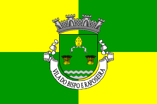 Mural crown Argent with four visible towers (town rank) and white scroll with inscription in black initials "VILA DO BISPO E RAPOSEIRA"
