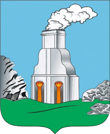 Heraldic shield : in an azure (blue, light blue) field, among silver rocks, on green ground stands a silver smoking smelting furnace with two gules (red) forges with golden fires inside.