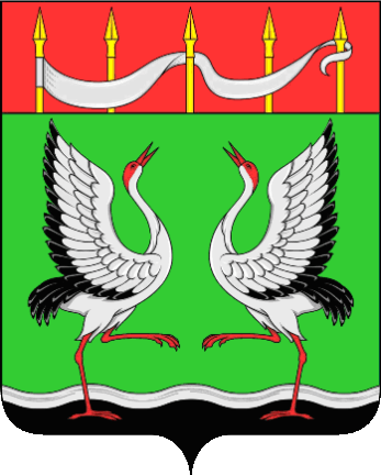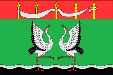 In a green field, under a chief gules burdened with five protruding golden ends of pikes, and on the far right peak there is a silver pennant intertwined with other peaks; two silver cranes dancing in reverse with their heads thrown back and wings raised, with beaks gules, heads and legs and with black wingtips and tails, and below their legs a black narrow wavy stripe, bordered with silver.