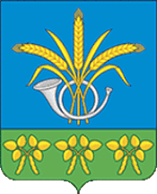 In an azure field above a green extremity included, burdened with three golden pairs of soybean leaves with two hanging pods, there are three golden ears of corn (two crosswise and one in a column), threaded through a low-positioned silver post horn.