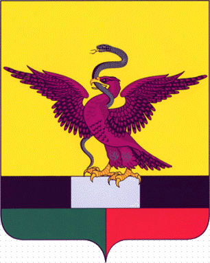 On a gold field, a reddish-brown eagle facing right with outstretched wings and with golden eyes, beak and claws, holding in its beak a black snake coiled around it, and standing on a base parted per fesse, above, tierced per pale black white black (or sable argent sable), below, parted per pale green and red (or vert and gules).