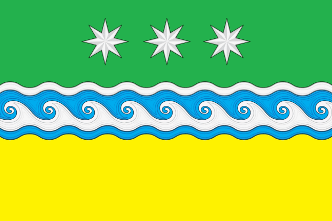 A rectangular cloth with a width to length ratio of 2:3, divided into two equal horizontal parts and reproducing in the middle a wavy blue and white stripe, 2/9 of the cloth's width wide, divided into equal parts in the form of running waves and bordered at the top with white and at the bottom with blue stripes (the width of the stripes is 1/30 of the cloth's width); in the middle of the green part of the cloth are reproduced images of three white eight-pointed stars from the coat of arms.