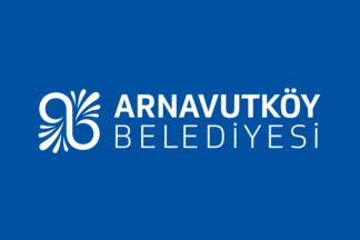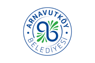 The flag of Arnavutköy is either white (photo) or divided blue-white, also used vertically (photo, image), with the municipality's emblem. "Belediyesi" means "Municipality".