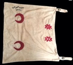 From the Ottoman Empire, a "Hilali Ahmer" flag, c. WWI, 1913. The top line reads in Arabic (right-to-left) as "harb eama" or in English as "general war". Below it are Hindi/India numerals meaning "1331" (A.H.) which correspond to the Gregorian/Western calendar year of "1913". The medical-aid organization was founded on 11 June 1868 and was named "Hilāl-i Ahmer Cemiyeti" ("Society of the Crimson Crescent"). Size: 30x35cm.